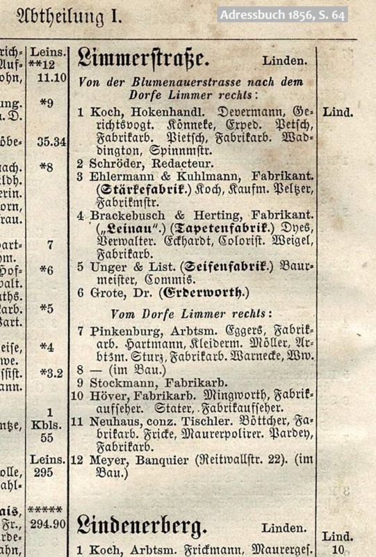 1856 sind im Adressbuch für die Limmerstraße 12 Nummern aufgeführt. „Von der Blumenauerstrasse nach dem Dorfe Limmer rechts" sind sechs Adressen angegeben, darunter die Stärkefabrik Ehlermann & Kuhlmann (Nr. 3), die Tapetenfabrik „Leinau", Brackebusch & Herting (Nr. 4) und die Seifenfabrik Unger & List (Nr. 5). Das Areal rechts der Limmerstraße erstreckte sich bis zur Leine/ Ihme.