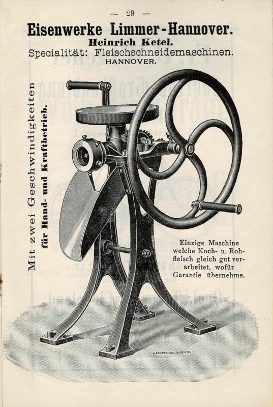 Diese Anzeige[1] der Eisenwerke Hannover-Limmer findet sich im Führer durch Hannover, Linden und Umgegend, herausgegeben zum 21. Deutschen Fleischer-Verbandstag der Fleischer-Innung. Da verwundert es nicht, dass die Eisenwerke die Herstellung von Fleischschneidemaschinen als ihre Specialität anpreisen.