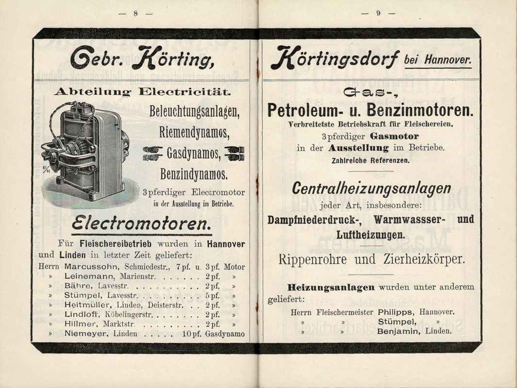 Die Annonce ist zielgerichtet auf Fleischreibetriebe ausgerichtet. Auf der linken Seite werden die 2-, 3-, 5- und 10-pferdigen Electromotoren aufgeführt, die für Fleischereibetriebe in Hannover und Linden in letzter Zeit geliefert wurden, darunter sind [Heinrich] Heitmüller in der Deisterstraße [76] und Niemeyer [?] in Linden.