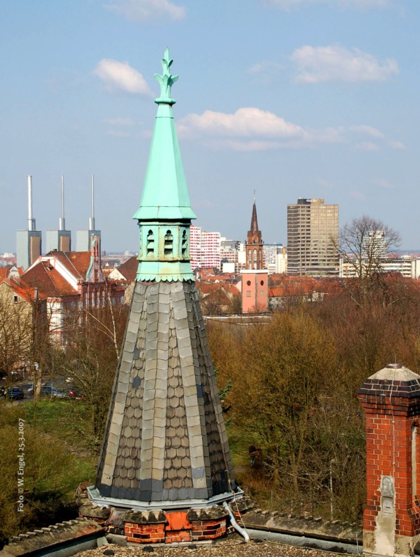Links das Heizkraftwerk, davor das Kleine Haus der IGS Linden (ehemalige Mittelschule III). Hinter dem Turm der Martinskirche erkennt man das Ihme-Zentrum. Das Hauptgebäude der IGS Linden verbirgt sich hinter den Bäumen, vor der Martinskirche ist nur das Dach der IGS Linden zu sehen.