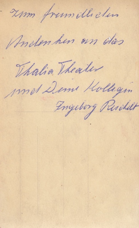 Wann das Foto von Ingeborg Reichelt gemacht wurde, war nicht zu ermitteln, vermutlich um 1947. Emmeline Schenk hatte es von ihrer Kollegin am Lindener Thalia-Theater mit einer Widmung erhalten.