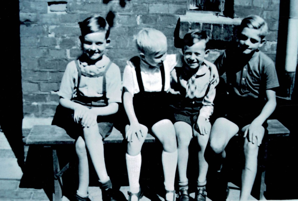 Das Foto wurde im August 1950 im Hinterhof der Weberstraße 23 aufgenommen. Zu sehen sind Arnfried Voigt, Günter Oldekop, Guntram Voigt (v.l.n.r.). Wer der vierte Junge ist, ist nicht bekannt.