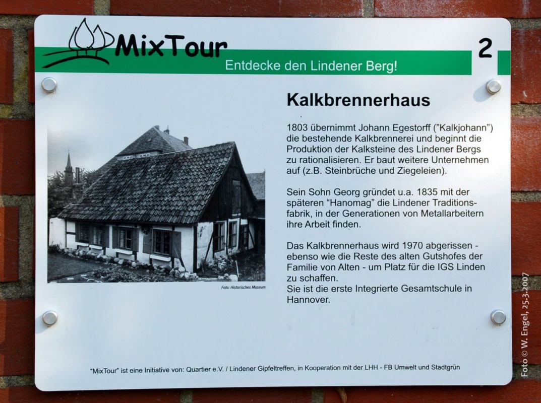 Text auf Informationstafel am Gebäude der IGS Linden: „Das Kalkbrennerhaus wird 1970 abgerissen (...) um Platz für die IGS Linden zu schaffen.“ Damit erweckt die Informationstafel den Eindruck, dass ein historisch wertvolles Gebäude der Gründung der ersten Integrierten Gesamtschule (IGS) in Hannover zum Opfer gefallen ist.