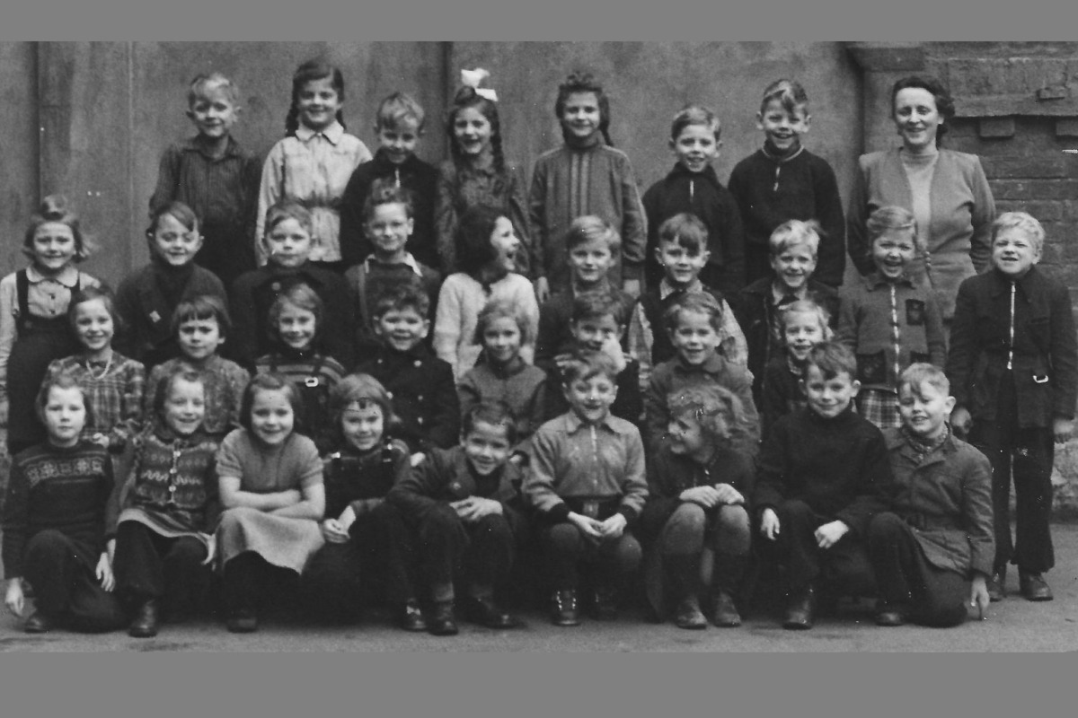 Volksschule Eleonorenstraße, Klassenfoto zur Einschulung im Frühjahr 1952. Unsere Klassenlehrerin hieß Frau Barnstorf. Ich stehe in der mittleren Reihe und bin der Fünfte von rechts.