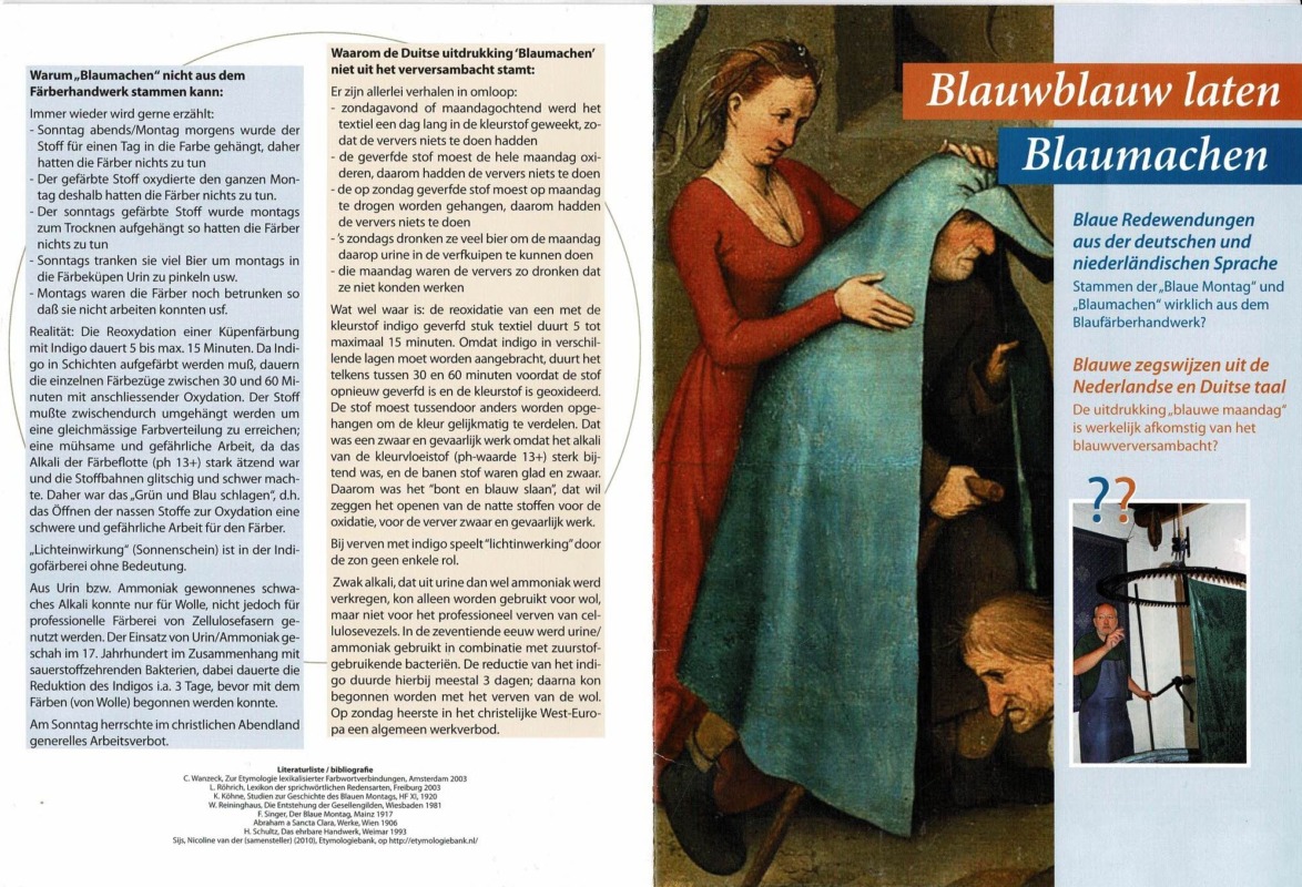 Das klingt schön, aber am Ende des Faltblattes wird unter der Überschrift „Warum Blaumachen nicht aus dem Färberhandwerk stammen kann“ aufgeklärt: